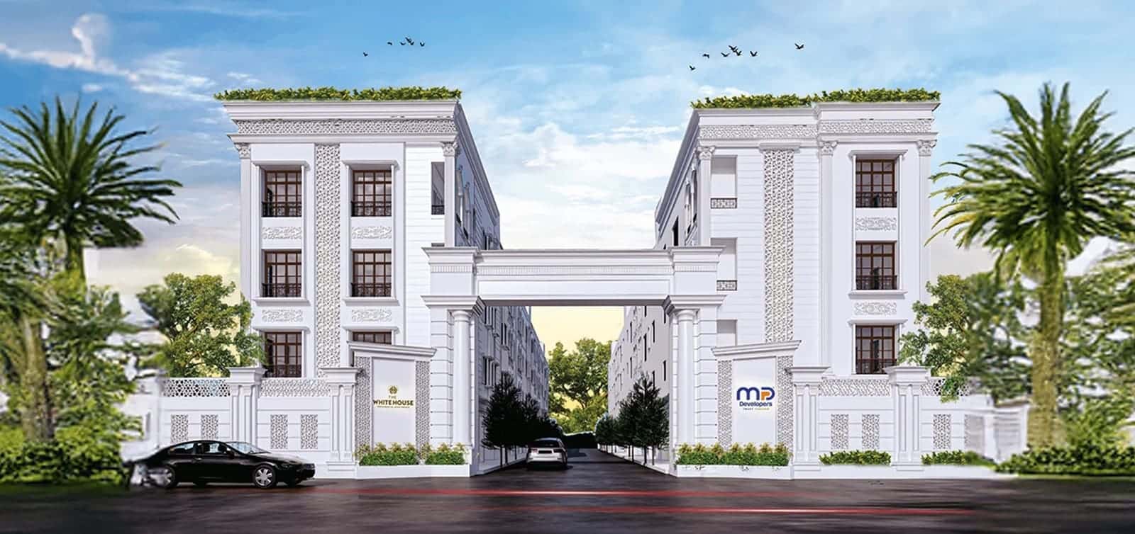 MP The White House is a boutique residential project located in the fast-developing neighborhood of Kolapakkam, Chennai. This low-rise community features just 36 thoughtfully designed 3 BHK apartments, ranging from 1104 to 1132 sq.ft., spread across a Stilt + 3 floors structure.